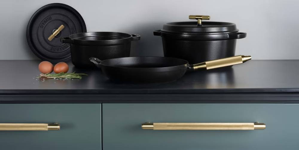 A „Half French, Full English” névre keresztelt kollekció egy régi elzászi és egy fiatalabb londoni márkát kapcsolt össze, hogy megalkossák közösen azokat az öntöttvas edényeket és serpenyőket, amelyekben tökéletesen el lehet készíteni egy komplett angol reggelit. Massimo Minale, az eredetileg egyedi motorkerékpárok készítésével foglalkozó Buster + Punch dizájnstúdió alapítója régóta nagy becsben tartja a saját Staub cocotte-edénygyűjteményét, így megkereste a híres francia márkát, hogy nem lenne-e kedvük kollaborálni úgy, hogy az edényekre felteszi a szabadalmaztatott, kézzel készült, gyémántmetszett, keresztbordázott, jellegzetes T‑fogantyúit rozsdamentes acél vagy sárgaréz verzióban. A Staubnak tetszett az ötlet, hogy modernizálhatja a dizájnklasszikusát, és Minale vágya is valóra vált, hogy be tudjon vlgre lépni a konyhai edények piacára 2024-ben.