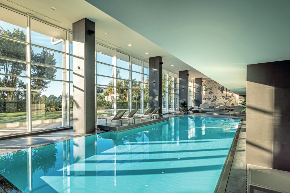 A belsőépítészethez képzőművészeket is felkértek, a Hotel Ambasadornál a tárgyak kiválasztásában pedig fontos szerep jutott a rijekai Modern Galéria akkori igazgatójának, Boris Vižintin művészettörténésznek és műkritikusnak is. A szállodák az 1960-as évek közepén ugyanis reprezentatív tereknek számítottak, azaz olyan monumentális műalkotások illettek a közösségi tereikbe, amelyek megtestesítették a modern jugoszláv életérzést, és bemutatták a hazai modern dizájnt is. Fontos volt így, hogy a berendezési tárgyak kilencven százaléka belföldön készüljön, a Hotel Ambasador szerepe ugyanis az is volt – amellett, hogy olyan notabilitásoknak, mint Josip Broz Tito és Indira Gandhi legyen hol megszállniuk errefelé -, hogy a külföld felé a jugoszláv ipar teljesítményét is bemutassák általa. A hotelt az elmúlt évtizedekben többször is átalakították, így ma már csak egyetlen műalkotás látható az eredeti helyén. Ez egy mozaik a víz alatti mitológiai világ ábrázolásával, a sellők és más tengeri lények a beltéri fűtött tengervizes medencének otthont adó helyiséget díszítik az 1300 négyzetméteres, a Feng Shui irányelvei alapján kialakított wellness- és spa-részlegen – amit akkor nézzünk is most meg tüzetesebben! A hotelnek van egy kültéri tengervizes medencéje is (ahonnan mindössze pár lépés a 2023-ban felújított privát strand a 12 kilométeres, Voloskótól Lovranig tartó I. Ferenc József-sétány mellett), bent pedig természetesen szaunák, gőz- és törökfürdő, valamint jacuzzi vár többek közt. Érdekesség a RAXUL technológiás kabin, amely a testkezelések megtervezéséhez kifejlesztett szoftvernek köszönhetően kiválasztja azt a hőtípus, amely a legalkalmasabb, legyen szó hőfürdőről, gőzfürdőről vagy római fürdőről – ezt pároknak is nagyon ajánlják, ilyenkor pezsgő és gyümölcstál is jár a rituálé mellé. De a spamenünek is van egy nagy erőssége: a masszázsokat és arckezeléseket a (SOTHY’S mellett) a Gemology termékeivel végzik. Ez a francia cég egy különleges eljárással vonja ki a nyomelemeket olyan ásványokból, mint a zafír, a rubin, a jáspis, a jáde vagy akár a gyémánt.